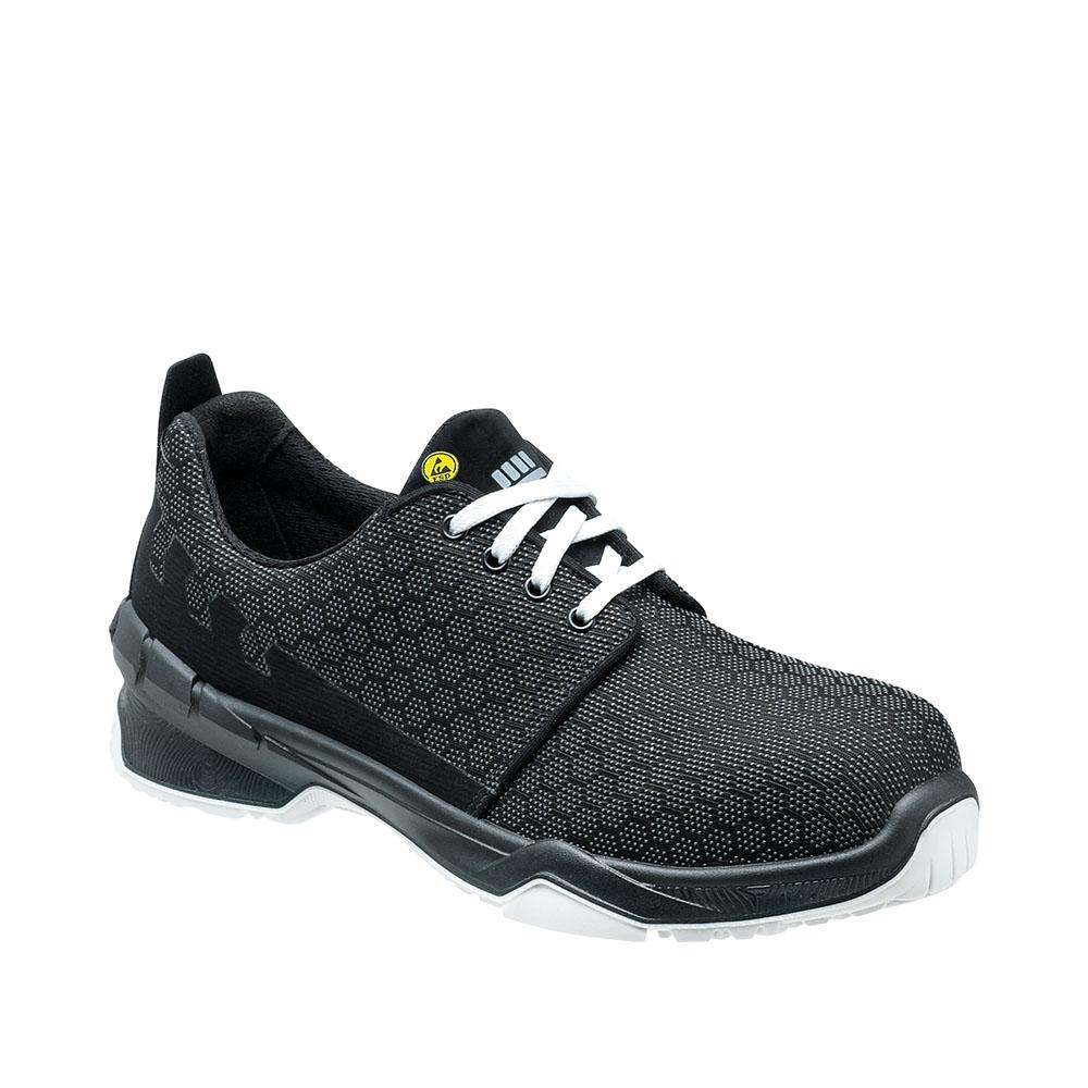 Ultralätt mikrofiber och stora insatser av nätmaterial med hög ventilationskvalitet, design utan metall, två individuellt justerbara kardborrband för optimalt stöd, tåskydd, funktionellt foder av ventilerande textil och mikrofiber, avtagbar komfortinnersula ERGO-SOFT ESD.